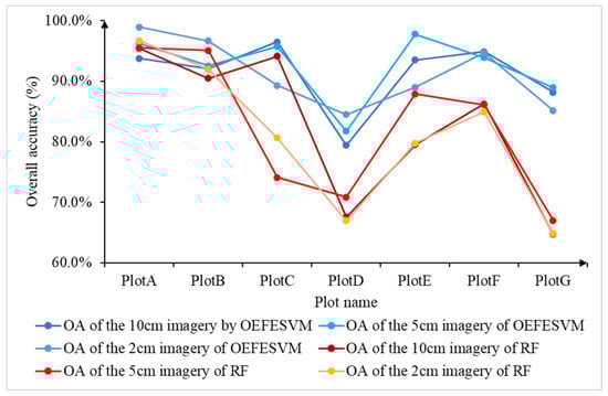 The percentages of plots with the OA values generated by the OEFESVM approach exceeding 90% for spatial resolutions of 2 cm, 5 cm, and 10 cm were 42.9% (3/7), 71.4% (5/7), and 71.4% (5/7), respectively (Table A1). The percentages of plots with the OA values generated by the RF method exceeding 90% for spatial resolutions of 2 cm, 5 cm, and 10 cm were 28.6% (2/7), 28.6% (2/7), and 42.9% (3/7), respectively (Table A2). Among the seven plots, the maximum OA value in the OEFESVM approach was achieved by the 2 cm spatial resolution classification in four cases, while the 5 cm and 10 cm spatial resolutions each yielded two instances (Figure 3). On the other hand, the RF classification results showed only one instance at 2 cm spatial resolution, four at 5 cm, and two at 10 cm (Figure 3). Among the five plots containing P. australis (PlotC, PlotD, PlotE, PlotF, and PlotG), only the maximum OA values from the OEFESVM classification result of PlotD came from a 2 cm spatial resolution image, while two plots each used 5 cm and 10 cm resolutions, respectively. In the RF classification results, three plots used 5 cm resolution and two plots used 10 cm resolution.