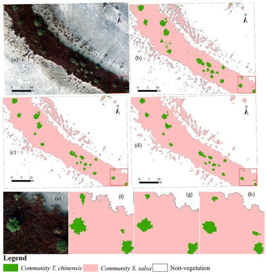 In PlotA (Figure 4), as the spatial resolution increased from 10 cm to 5 cm to 2 cm, more vegetation patches were classified, more small-sized vegetation patches were detected, and the T. chinensis patches were detected with more complete morphology and more zigzagged edges (Figure 4f–h), and the 5 cm spatial resolution image did not detect the small T. chinensis patch in the lower right of the image (Figure 4c,g).