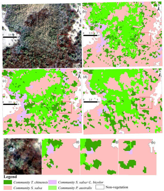 Vegetation composition and structure of PlotD. The red frame in the middle-right of (a–d) represented the region shown in (e–h). (a) The RGB image; (b) vegetation classification from the 2 cm spatial resolution image; (c) vegetation classification from the 5 cm spatial resolution image; (d) vegetation classification from the 10 cm spatial resolution image; (e) subset of (a); (f) subset of (b); (g) subset of (c); and (h) subset of (d).