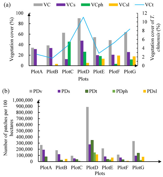 Vegetation composition and structure of seven plots. (a) Vegetation cover (VC), vegetation cover of S. salsa patches (VCs), T. chinensis patches (VCt), P. australis patches (VCph), and S. salsa + L. bicolor patches (VCsl); (b) number of vegetation patches per 100 hectares (PDv), number of S. salsa patches per 100 hectares (PDs), number of T. chinensis patches per 100 hectares (PDt), number of P. australis patches per 100 hectares (PDph), and number of S. salsa + L. bicolor patches per 100 hectares (PDsl); (c) proportional abundance of S. salsa patches (Ps), T. chinensis patches (Pt), P. australis patches (Pph), and S. salsa + L. bicolor patches (Psl), and Shannon–Wiener diversity (H), and evenness (E); and (d) relative dominance of S. salsa patches (RDOs), T. chinensis patches (RDOt), P. australis patches (RDOph), S. salsa + L. bicolor patches (RDOsl), and Moran’s I.