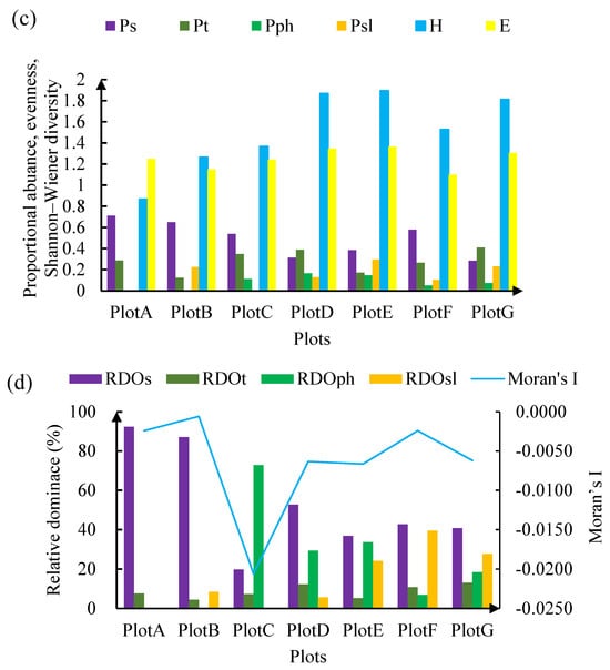 The Shannon–Wiener diversity index (Figure 7c) showed that PlotD and PlotE had the highest Shannon–Wiener diversity, followed by PlotG, and the species evenness was high for PlotD, PlotE, and PlotG (Figure 7c).