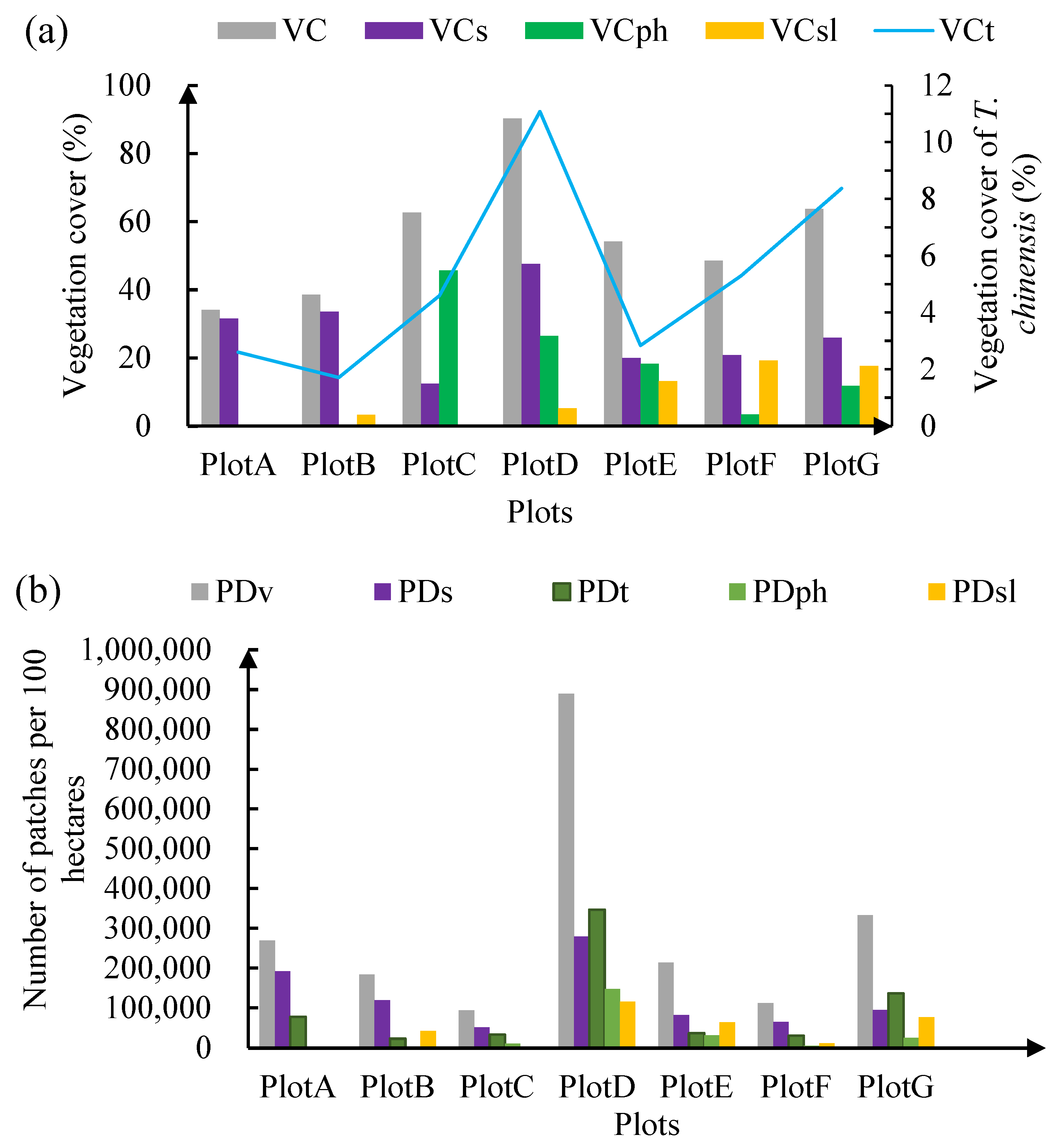 | 10,000100 | Patch density () of the th community equals the total number of th community patches (), divided by the total area (), and multiplied by 10,000 and 100 (to convert to 100 hectares) in a given plot [37] | |