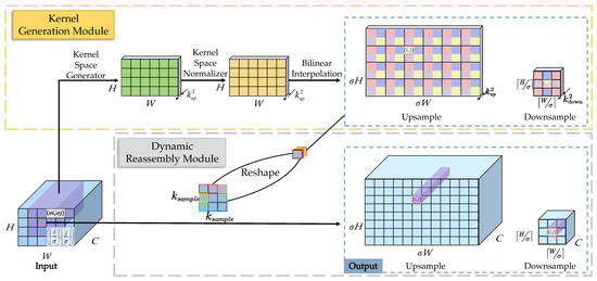As shown in the lower part of Figure 2, the dynamic reassembly module is designed to generate the resampled feature map with dimensions for upsampling and for downsampling. To compute the response at position in the c-th feature map of the output, two sequential operations are performed. First, the predicted kernel at position is extracted from the expanded kernel space. Second, a neighborhood is retrieved from the c-th input feature map, centered at the pixel location corresponding to output position . For upsampling operations, this corresponds to locations within the input space, while for downsampling it operates within the input space. The final output response derives from the inner product between the selected kernel and retrieved pixel neighborhood. This mechanism enhances the feature representation by aggregating relevant local information through the content-adaptive kernels.