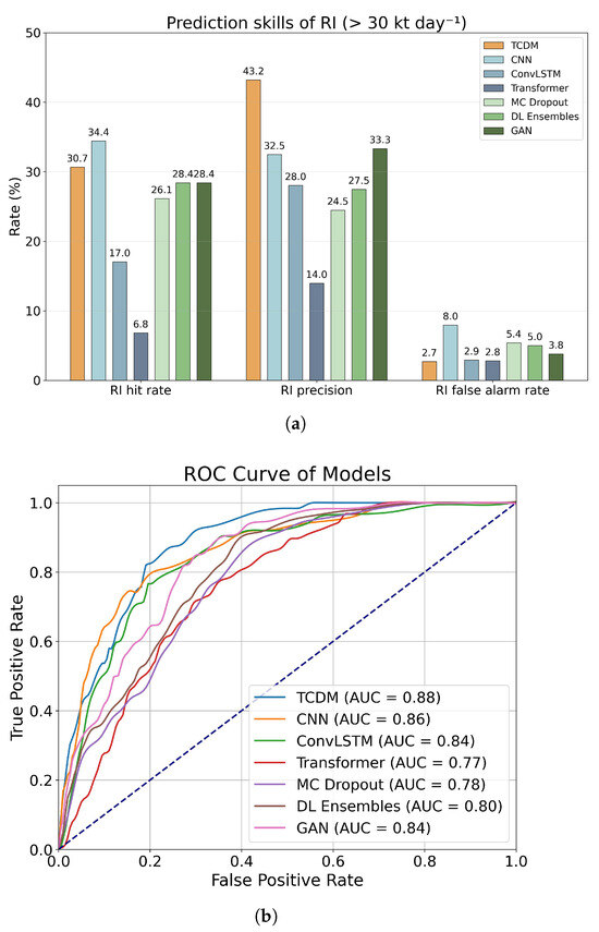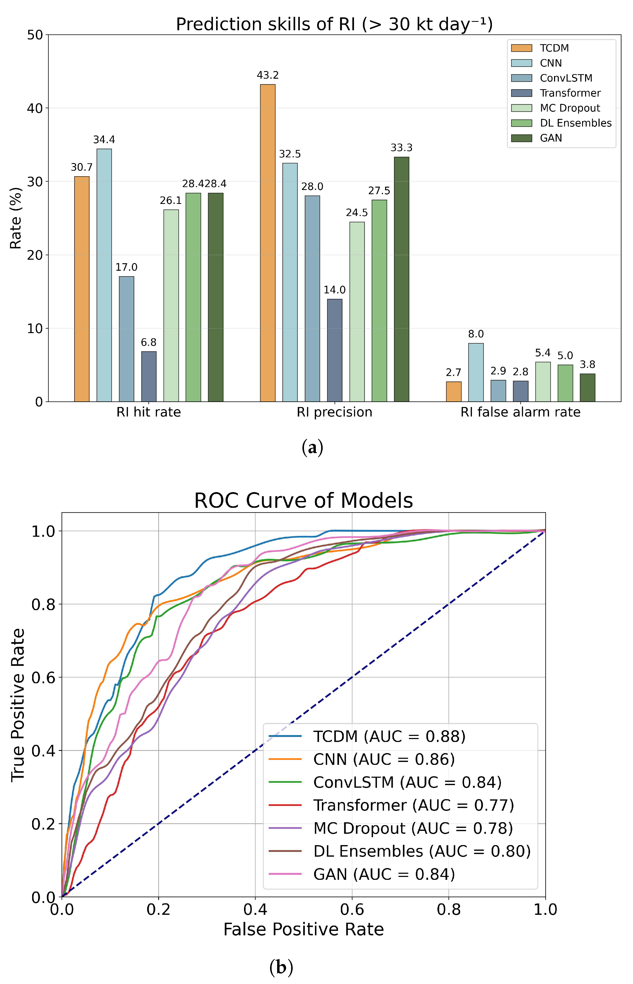 - Compared with mainstream baseline models, TCDM demonstrates a substantial improvement in forecasting rapid intensification (RI) events, achieving the highest hit rate (30.7%) and precision (43.2%) and the lowest false alarm rate (2.7%) in the testing experiments.