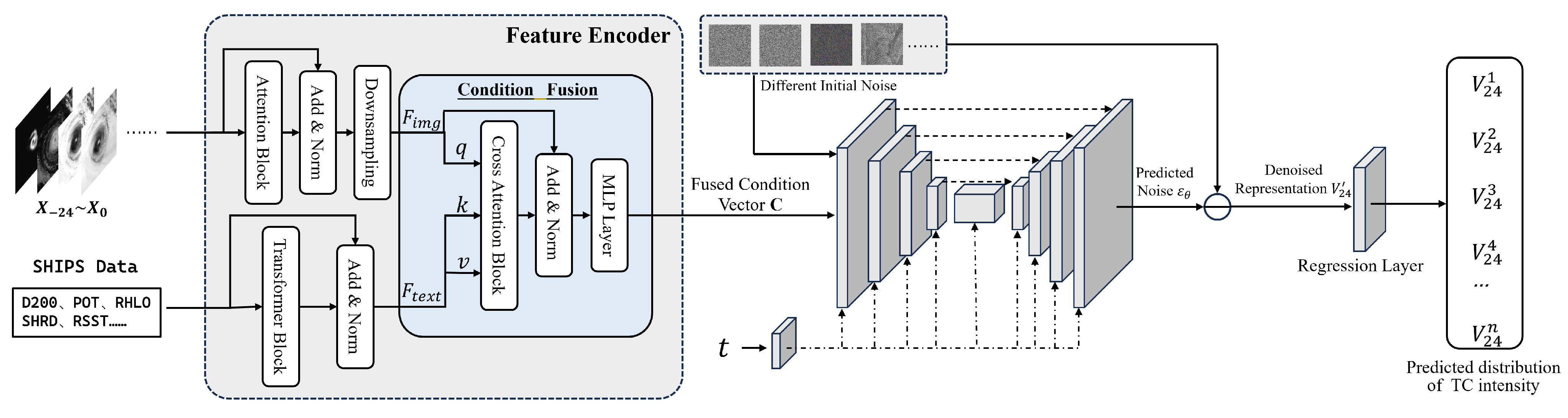 - This study proposes a novel conditional diffusion model (TCDM), representing the first probabilistic generative framework for tropical cyclone (TC) intensity forecasting capable of integrating multimodal data to generate the full future intensity probability distribution.