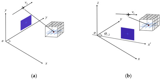 The point cloud data obtained from independent observations of each dual-UAV subsystem are located in a local oblique coordinate system (see Figure 3). The oblique coordinate system is constructed using the trajectory of platform 1 as the X′-axis and the trajectory of platform 2 as the Y′-axis. The local coordinates of target P, denoted as in this system, require mapping to the global Cartesian coordinate system prior to data fusion.