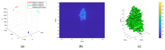 Three-dimensional reconstruction results of horizontal-cross SAR 3D reconstruction algorithm. (a) Radar observation model; (b) 2D complex-valued image from the platform 3; (c) Scattering point 3D reconstruction results.
