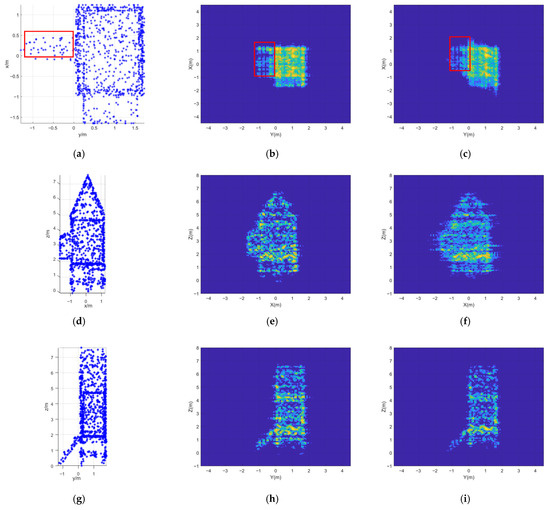 Analysis of the projection results for each plane. (a,d,g) The X-Y, X-Z, Y-Z plane projections of the scattering point model; (b,e,h) Projections of the 3D reconstruction results of platform 1 and platform 2 in the X-Y, X-Z, Y-Z planes; (c,f,i) Projections of the 3D reconstruction results of platform 1, platform 2, and platform 3 in the X-Y, X-Z, and Y-Z planes.
