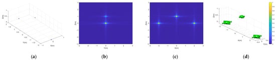 The position of each scattering center, , is defined in the global Cartesian coordinate system as . In the dual-platform configuration (platforms 1 and 2), the reconstruction output is given by (22), which involves a double summation. When , cross-terms arise from the product of the x-direction response from scattering center and the y-direction response from scattering center . These cross-terms are responsible for generating ghost targets, as illustrated by the red points in Figure 4, in contrast to the true targets marked in blue. The ghosting effect is primarily caused by limited spatial sampling in the horizontal plane under limited observation perspectives.