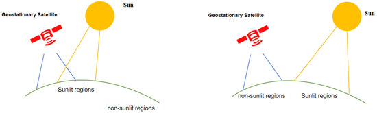 Two primary natural phenomena exacerbate these challenges: the rotation of the Earth and seasonal variation in the solar angle. Due to the Earth’s rotation, sunlit regions shift continuously relative to geostationary satellites. As shown in Figure 1, only areas currently illuminated by sunlight can yield reliable visible-light imagery. Therefore, spatial variation in daylight duration causes discrepancies when a fixed time threshold is used to determine usable visible data, potentially introducing noisy inputs in some regions. By contrast, seasonal changes in the solar angle, driven by the Earth’s axial tilt and orbit, lead to shifts in sunrise and sunset times across different latitudes. As a result, the timing and extent of valid visible-light coverage vary significantly. In winter months, visible-light data collected after 6:00 may contain considerable noise due to delayed sunrise. Conversely, in summer, visible data from the early-morning hours may be excluded despite their valuable synthesis information.