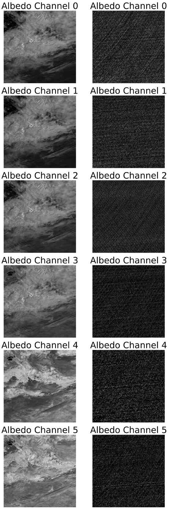 Grayscale albedo images from 6 visible channels (0–5) of the Himawari-8 satellite under different illumination conditions. The left column corresponds to daytime observations at 09:00 on 21 June 2019, while the right column corresponds to nighttime observations at 23:00 on 24 June 2019. Both sets cover the same spatial region (25°–30.12°N, 100°–105.12°E). Compared with the daytime images, the nighttime images show significantly reduced albedo and increased noise, particularly in the lower channels, illustrating the impact of limited solar illumination on visible-band satellite observations.
