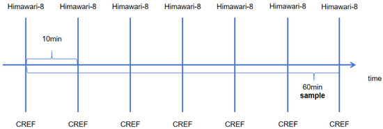 Schematic illustration of the temporal downsampling and pairing strategy used in this study. Both Himawari-8 and composite reflectivity (CREF) data were originally provided at a 10-min temporal resolution (vertical bars). For dataset integration, both datasets were downsampled to 60-min resolution before pairing.