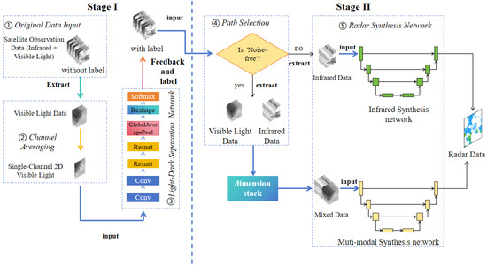 Overview of the proposed dual-stage synthesis framework. Stage 1 (left) represents the light/dark classification phase, in which visible-band data are averaged spectrally and then classified as noise-free or noisy samples by the light/dark separation network. Stage 2 (right) represents the dual-path radar synthesis phase, in which noise-free data are processed by the multimodal synthesis network using both visible and infrared inputs, whereas noisy data are handled by an infrared-only synthesis network. This architecture enables adaptive, robust radar CREF synthesis under varying illumination conditions.
