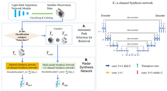 Radar synthesis network structure. (A) Path selection following automatic identification of labeled data. (B) CREF synthesis. (C) Synthesis architecture used for CREF synthesis. The synthesis networks shown in (B) were derived from the architecture shown in (C), with different input channels.