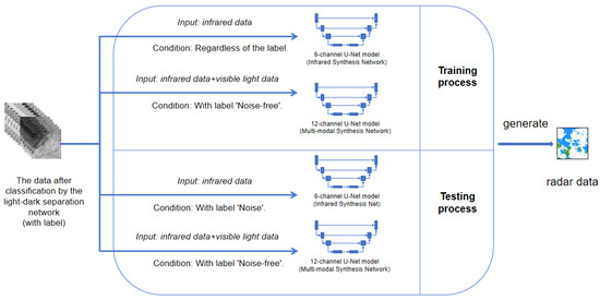 Based on the light/dark classification results, data are divided into noisy (nighttime or insufficient illumination) and noise-free (daytime or sufficient illumination) samples, and the corresponding synthesis path is automatically selected (Figure 6A). For noisy data, only the infrared channel () is used as input for radar synthesis, whereas for noise-free data, and the visible-light channel ) are concatenated along the channel dimension to form a 12-channel multimodal input, as follows: