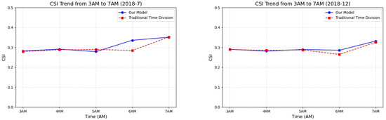 Radar synthesis performance was assessed using the CSI values across different timestamps. CSI values around 6:00 in July increased due to the earlier sunrise (Figure 11), which enabled more effective use of visible channels. In contrast, CSI values in December decreased around 6:00 due to noise, highlighting the limitations of static time-based segmentation.