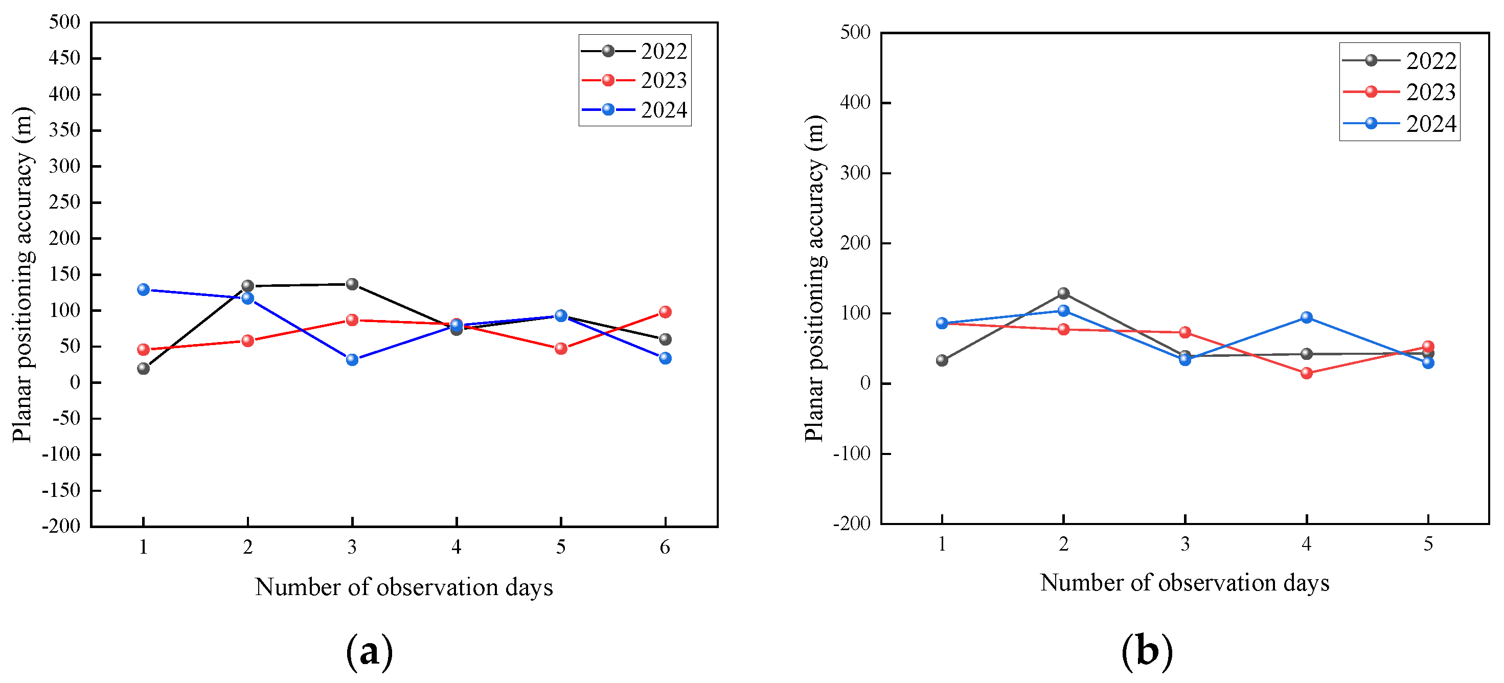- The geometric positioning accuracy of the LT-1 satellite between the two satellites remained relatively stable from 2022 to 2024, and the planar positioning accuracy in 2023 was more stable compared to that in 2022 and 2024.