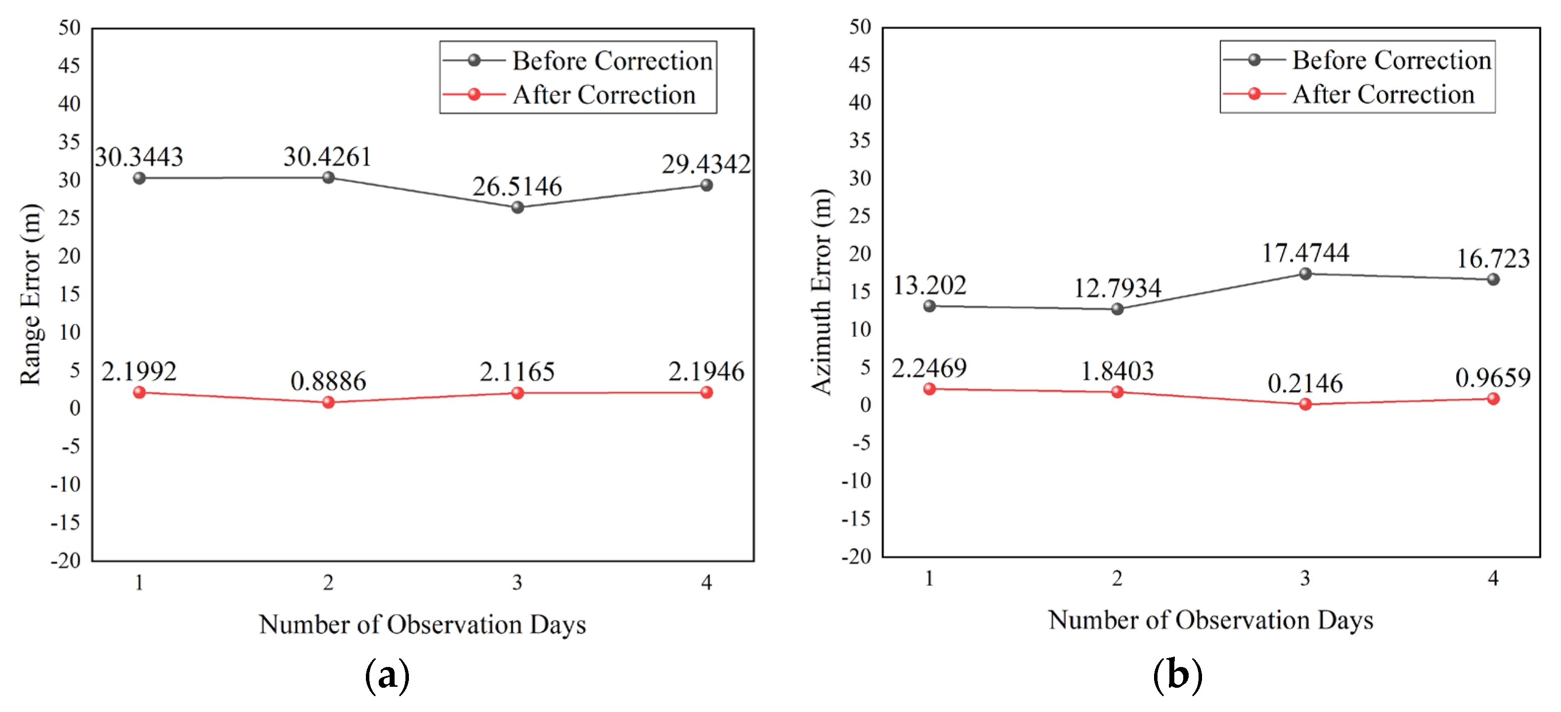 - After precise correction, the image positioning error can be reduced to about 2.1 m in range and 1.3 m in azimuth, and the geometric positioning accuracy is better than 3.0 m.