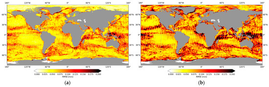 Figure 6 shows maps of RMSE for the two denoising methods and a comparison between them. In the two methods, the geographical position of the ODYSEA swaths to be denoised is not provided as an input. The importance of RMSE in some areas is due to several factors. The most obvious are low-wind conditions. In these conditions, only the largest structures are restored. This can be seen in Figure 5 between 3500 and 5000 km along-track. In areas of high variability, such as the Gulf Stream or the Agulhas Current, both methods consider the smallest eddies as noise. The RMSE improvement for the UNet compared to the Gaussian filter is homogeneous and is around 25%, except in the polar areas.