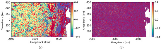 where f is the Coriolis parameter, is the eastward direction and the northward direction. In this study, they are computed in the same way as for the SWOT product, i.e., by using a 9-point stencil derivative [10,19]. Information on the impact of the derivation method is provided in Appendix B.