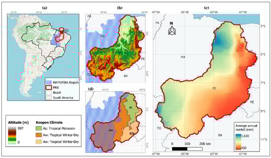 Geographic location (a), altitude (b), average annual rainfall (AAR, 2001–2020, BR-DWGD) (c), and Köppen climate classification (d) of the Parnaíba River Basin (PRB), Brazil.