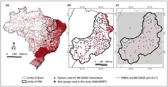 Spatial distribution of the rain gauge networks and gridded datasets used in this study. (a) BR-DWGD stations across Brazil [22]; (b) overlap between BR-DWGD network and rain gauges used in this study; (c) IMERG and BR-DWGD 0.1° grid over the Parnaíba River Basin (PRB).