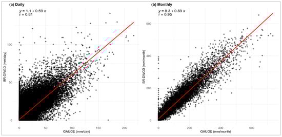 Scatterplots between estimated (BR-DWGD) and observed (Gauge) daily (a) and monthly precipitation data (b). The red line indicates the 1:1 reference line (perfect agreement between observed and estimated values).