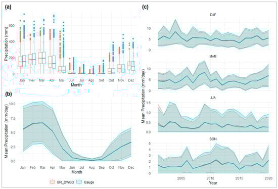 Figure 4b,c present the mean monthly and seasonal precipitation, respectively, highlighting intra-annual and inter-annual precipitation variability. A broader variability range is noted during rainy months, indicating higher uncertainty associated with precipitation estimates for this period. Gauge data capture this variability more effectively, whereas BR-DWGD tends to smooth out the estimates, particularly during months of intense rainfall. Nevertheless, BR-DWGD shows greater accuracy during dry seasons (JJA and SON), reinforcing its utility for seasonal analyses.