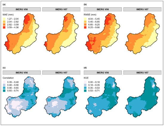 Spatial distribution of evaluation metrics between IMERG V06 and V07 compared with BR-DWGD daily precipitation in the Parnaíba basin (2001–2020). (a) Mean absolute error (MAE); (b) root mean square error (RMSE); (c) correlation coefficient; (d) Kling-Gupta efficiency (KGE).