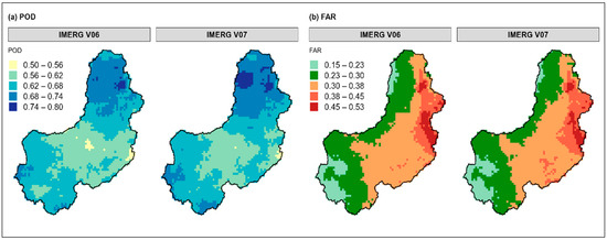 The performance improvements identified for IMERG V07 in the PRB—particularly the reduction in systematic bias, decrease in false alarms, and higher Kling–Gupta Efficiency (KGE)—are consistent with global trends observed in recent evaluations. Rozante & Rozante [11] reported similar reductions in false alarms and improved correlation for V07 across Brazil, while Guo et al. [6] and Tang et al. [4] documented comparable increases in KGE and decreases in RMSE over complex terrain in China and Southeast Asia. The convergence between these studies and the present results reinforces that the improvements observed in the PRB are not localized but rather part of a broader global enhancement achieved through the V07 reprocessing.