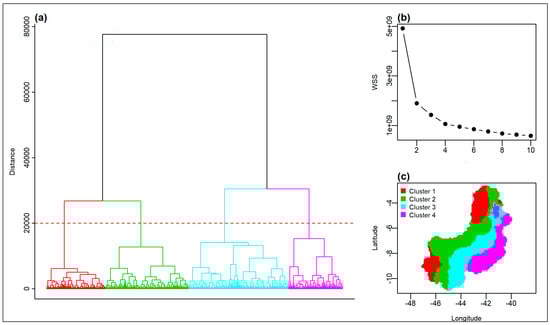 Homogeneous regions for the Parnaíba river basin (2001–2020) based on BR-DWGD data: (a) dendrogram using Ward’s method, with the red line indicating the four-cluster cut-off; (b) elbow method showing the inflection at k = 4; and (c) spatial distribution of the resulting homogeneous precipitation regions.