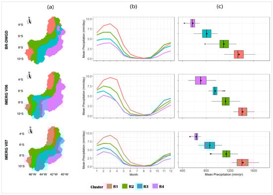 The final configuration with four homogeneous clusters was adopted for subsequent analyses. The cophenetic correlation coefficients obtained were 0.68 for BR-DWGD, 0.62 for IMERG V06, and 0.64 for IMERG V07, indicating moderate yet acceptable clustering stability within a basin characterized by high climatic heterogeneity [33]. These values are consistent with those reported in previous precipitation regionalization studies conducted in complex climatic domains, confirming the robustness of the adopted classification.