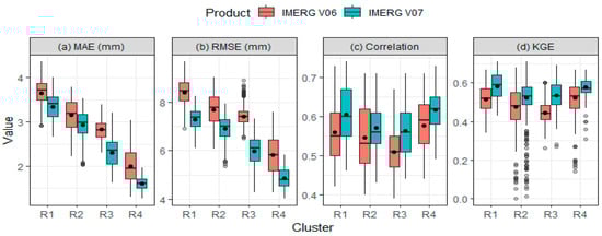 Figure 10 presents the performance of IMERG versions V06 and V07 across the four homogeneous clusters, evaluated using the MAE, RMSE, Correlation, and Kling–Gupta Efficiency (KGE) metrics. Among these, KGE was selected as the main comparative indicator, as it integrates correlation, bias, and variability components into a single index, providing a more comprehensive measure of performance consistency.