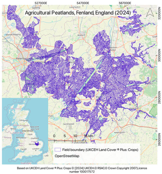 Study area map showing the location of agricultural peatlands in the East Anglian region of England and the field boundaries demarcating individual fields. The extent of the agricultural peatlands was based on the Peaty Soils Location map of England by BGS and NSRI.