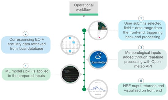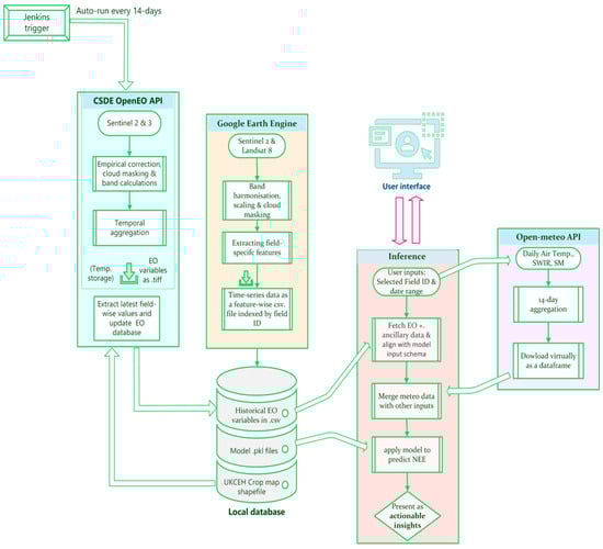 Overview of the operational CO2 flux monitoring framework. The system integrates EO, meteorological, and ancillary data through automated workflows, enabling user-driven inference of Net Ecosystem Exchange (NEE) at the field scale via a web-based interface.
