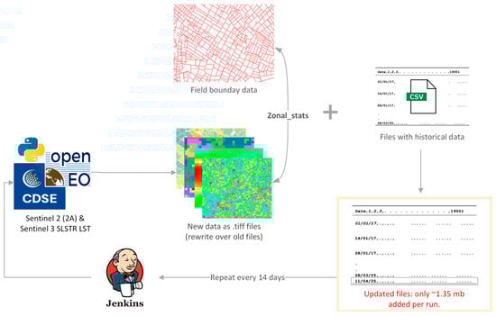 To ensure the system remains up to date with new data without the need for human intervention, the OpenEO API processing chain was fully automated using Continuous Integration/Deployment (CI/CD) [61] in Jenkins [61,62], an off-the-shelf, open source continuous integration (CI) system that supports extensible pipelines and plugins, making it well-suited for scientific data tasks [62]. In our setup, the primary automation pipeline is triggered biweekly via a cron schedule to perform a sparse checkout of the required directories from GitLab, which is the version control system used. It creates a Python virtual environment (or activates if already present), runs the OpenEO-based data download and processing script (described in Section 2.4.2 (i)), and updates the local database. Temporary .tiff files are overwritten each cycle to minimize storage use, and only the extracted information is stored permanently. The secondary pipeline is triggered automatically upon completion of the first; this stage synchronizes data folders, commits updated files to GitLab, and pushes them to the main branch.