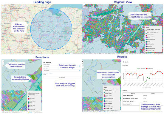 The web-based front-end for field-scale analysis. It allows users to zoom into the Fens, England, explore and select fields of interest (Regional View), configure inputs and run analysis (Selections), and view NEE outputs presented as actionable insights through colour-coded, interactive plots and a field summary table (Results).