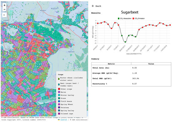 (a) Using the web-based front-end, we select Rosedene Farm (field #11367) and specify a date range corresponding to a known cropping season (e.g., 8 April 2017–5 February 2018, the period during which sugar beet was cultivated). Upon submission, the system retrieves and processes the relevant EO and meteorological data, returning a biweekly NEE time series and summary statistics with a response time of 6.06 s. We obtain an average NEE of 1.18 gC/m2/day and a cumulative NEE: 363.94 gC/m2 in the summary section (Figure 6).