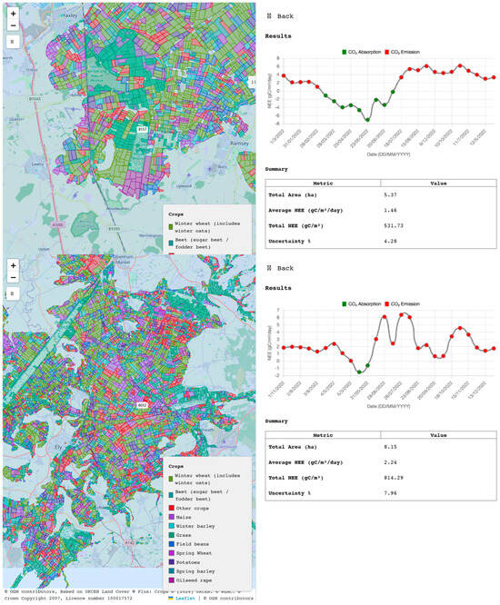 To demonstrate the spatially scalable application of the tool, a user may query fields from different parts of the Fenland, and of different land use type. We run analyses in the same year (2022) for a cropland site (Redmere Farm; 52.443°N, 0.4195°E; Field ID #8032) and a managed grassland site (Woodwalton Fen (52.46°N, −0.1851°W; Field ID: #8157), both of which have been monitored by flux towers in 2022 [67]. Both sites lie in different parts of the Fenland and are separated by a substantial distance (Figure 7 and Figure S1). Outputs took an average of 6.15 s to generate and clearly differentiate the CO2 flux signatures between cropland and grassland systems, revealing a greater NEE amplitude but lower net emissions in the grassland site compared to the higher temporal variability and net emissions from the cropland site. The colour-coded time series also highlights periods of CO2 absorption (in green), which were substantially longer in the grassland site (Figure 7, (top)). Similar comparisons can help assess the effectiveness of land use change (e.g., cropland-to-grassland conversion), and comparisons between grasslands can help in measuring the impact of rewetting measures proposed for grasslands in the area [46,47], as well as the impact of other agri-environment interventions.