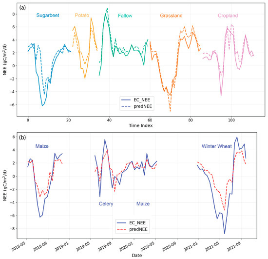 Time series plots comparing predicted NEE (dashed line) to the observed data from Eddy Covariance flux towers (solid line) for (a) use-case scenarios described in Section 4 and (b) an independent flux tower site (unseen by the model) from East Anglian Fens (Engine Farm; 52.423°N, 0.386°E). Figure highlights the performance of the monitoring system across different sites, land use categories, and management types. Accompanying scatter plot is provided in the Supplementary Materials (Figure S4).