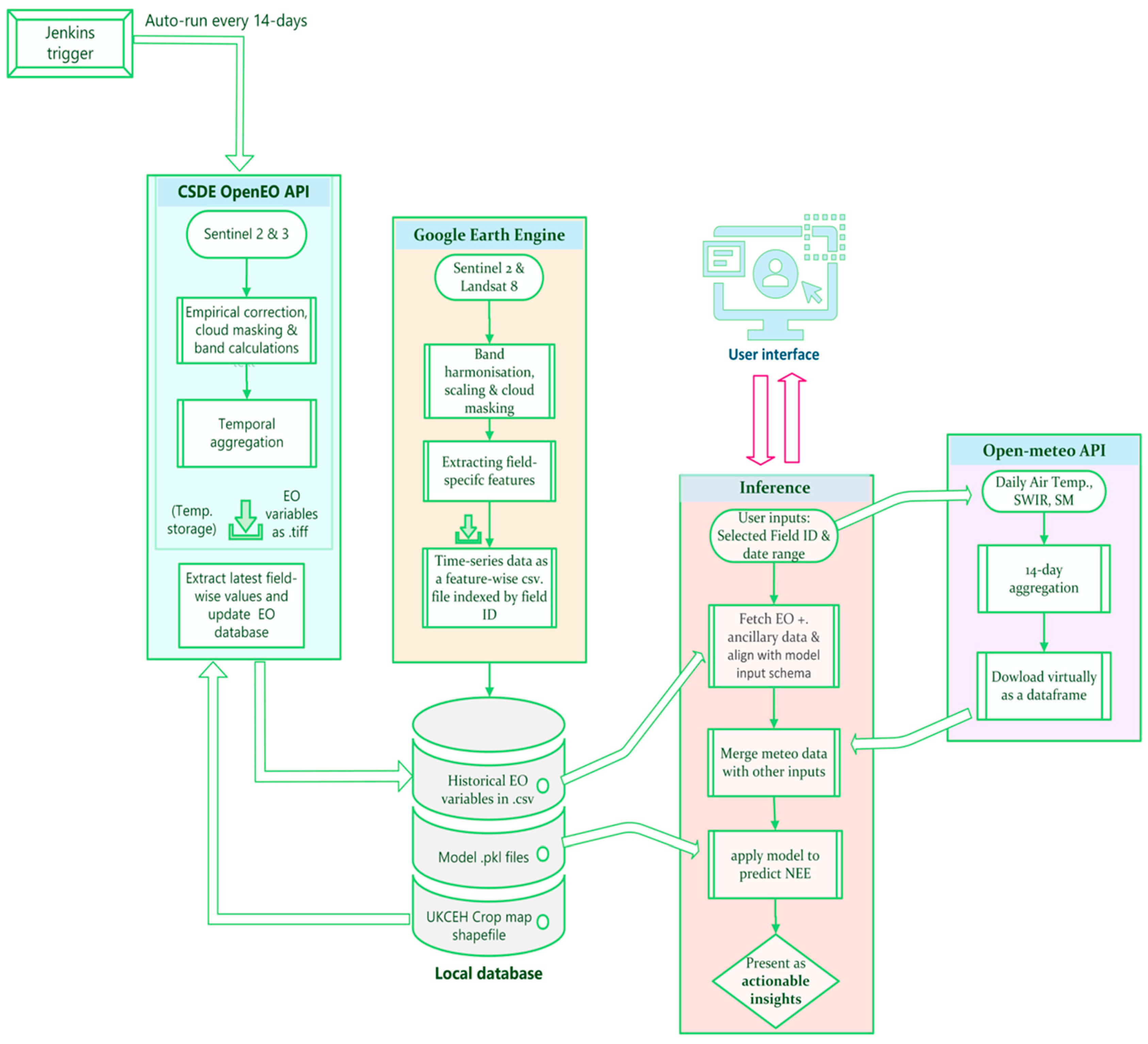 - User-driven data integration and inferencing: Based on user-defined inputs (e.g., location, time), the system fetches relevant EO, ancillary, and meteorological data and integrates them into the model pipeline. The pre-trained model processes the input data to produce the Net Ecosystem Exchange of CO2 output.