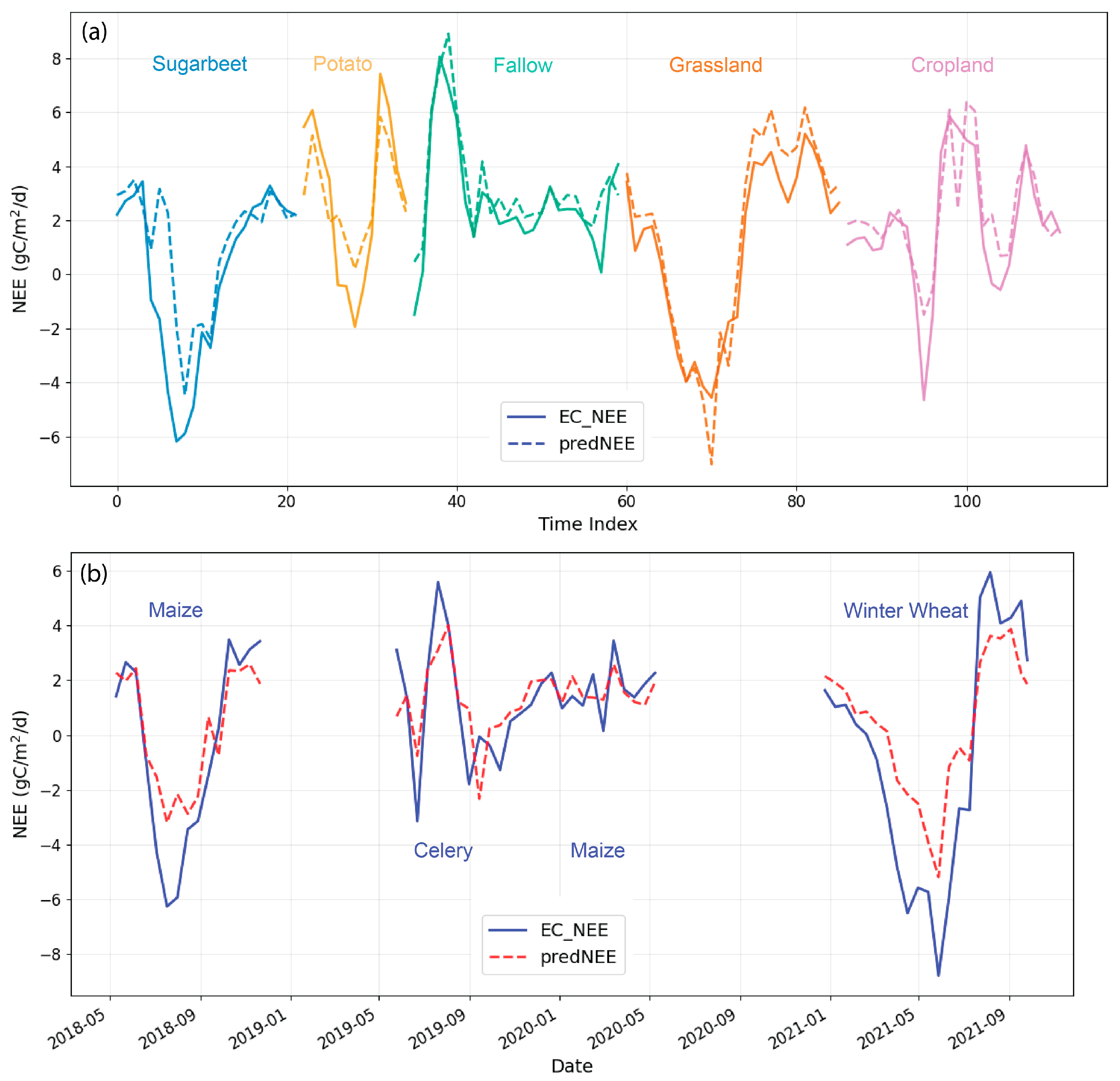 - Gottschalk, P.; Kalhori, A.; Li, Z.; Wille, C.; Sachs, T. Monitoring cropland daily carbon dioxide exchange at field scales with Sentinel-2 satellite imagery. Biogeosciences 2024, 21, 3593–3616. [Google Scholar] [CrossRef]