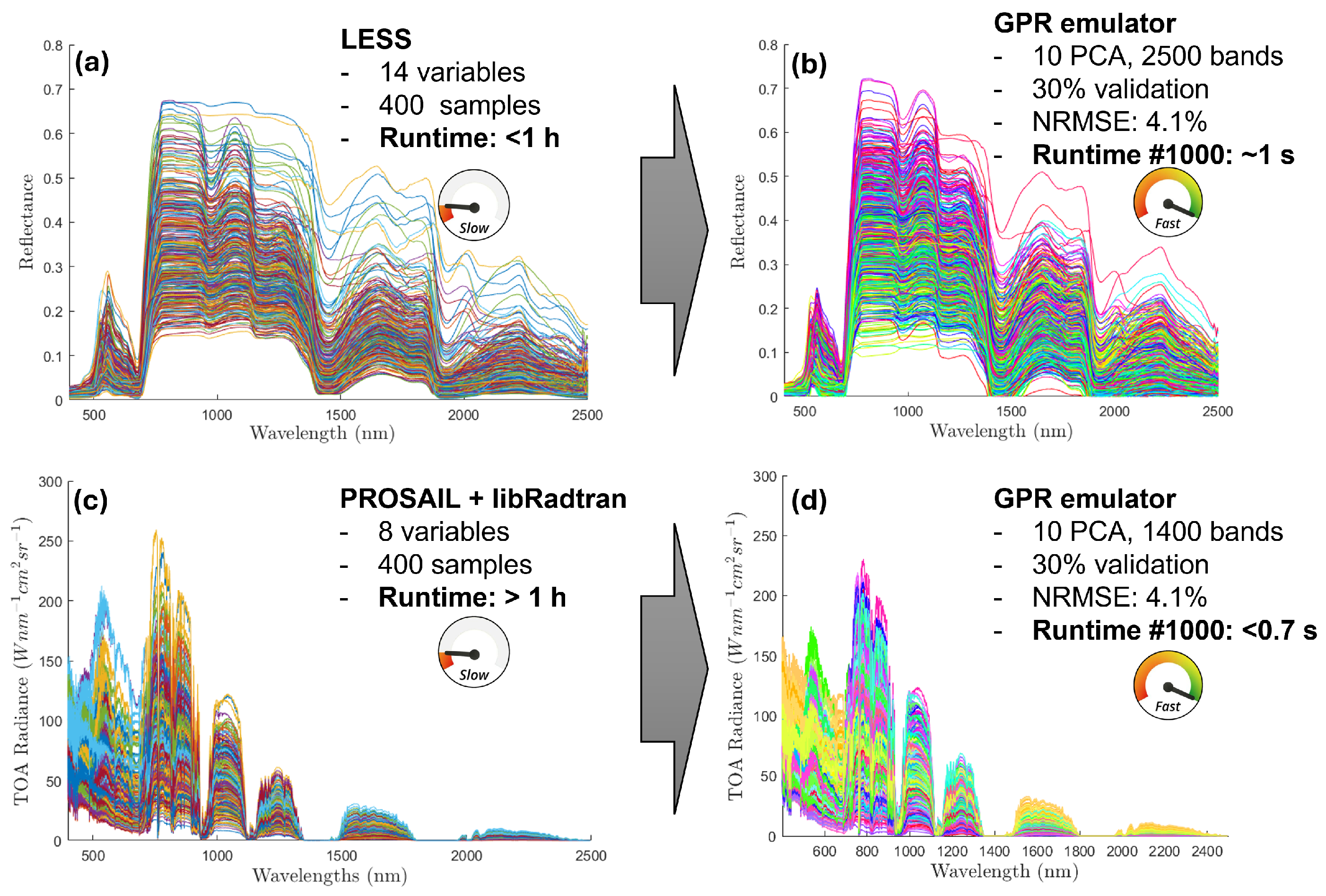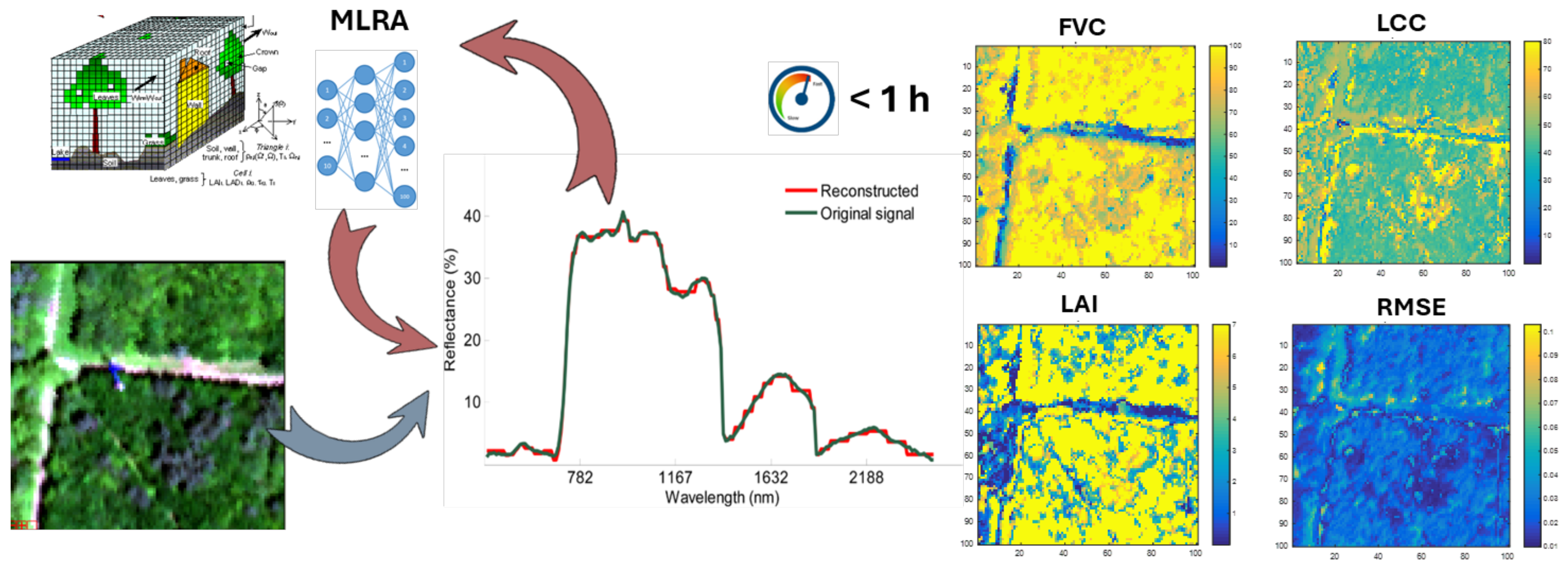 - Emulation via machine learning regression algorithms (MLRAs) accurately reproduces vegetation and atmospheric RTMs while accelerating computations by –.