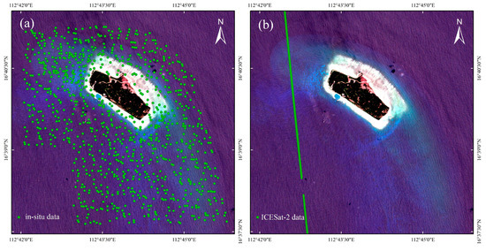 To further examine the effectiveness of our results, we used in situ survey data to test the inversion result instead of cross-validating from training data. The in situ data were measured by a shipborne single-beam echosounder from the First Institute of Oceanography, Ministry of Natural Resources, in 2020, which has centimeter-level error in this area and higher spatial resolution (footprint diameter ≈ 10 m) than ICESat-2/ATLAS. Due to the different post-processing methods used for the in situ data, the data were recorded as points or DEMs, and the in situ points were interpolated using IDW to evaluate the fit to the inversion results, which were organized in grid format.