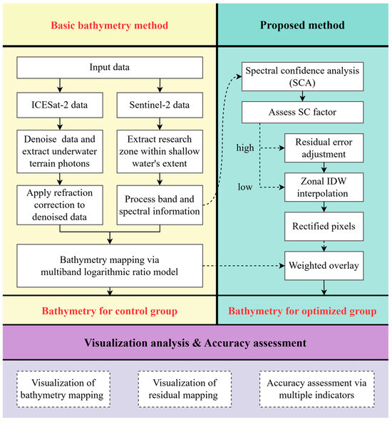 The overall steps of the workflow followed in this study are shown in Figure 3. Our strategy divides the main experiment into two groups and is composed of the following four steps: data preprocessing, preliminary bathymetry estimation via a basic semiempirical model, extraction of virtual control points, and bathymetry rectification based on virtual control points. The general strategy of rectification is exhibited in the teal zone of Figure 3.