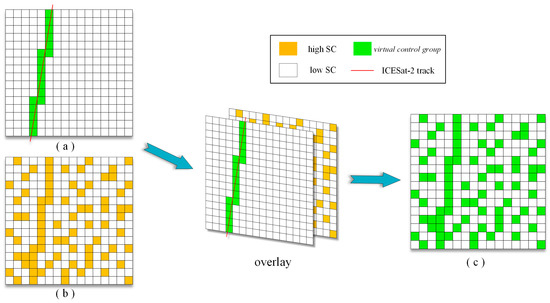 Primary process of SCA. (a) Spatial relationship between image coverage and the straight track of ICESat-2. (b) SC mask. (c) The expansion of training data from high-SC pixels.