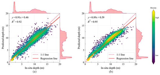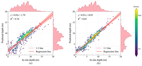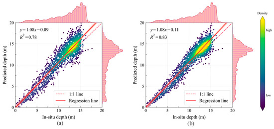 We further applied the in situ points referred to above to assess the accuracy, and the results are shown in Table 4. It is evident that the optimized group performs better in all indicators, with an increase of 5% in R2. The scatter plots and edge histograms are shown in Figure 12. In addition to the fewer discrete points and higher scatter density in the optimized group than in the control group, there is also better agreement of the trend lines between the in situ data and the optimized predicted result. The control group tends to predict water depths with relatively low values, which presents an abnormal subpeak in shallow water. The R2 coefficient of the optimized group is larger than that of the control group, indicating that the water depth inversion results of the optimized group are closer to the in situ data.