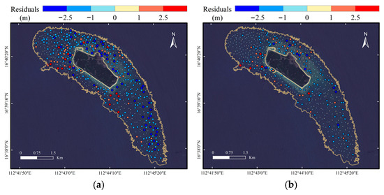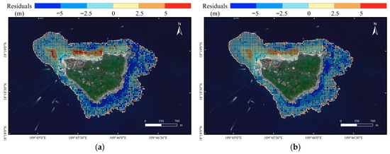 Figure 10 shows the distribution of residual points around Ganquan Island. In Figure 10b, there are a few residual points with absolute values greater than 1 m in the northern part of the experimental area, whereas Figure 10a generally has points that are deeper blue, indicating the underestimation of the predicted water depth. For the region on the edge of Ganquan Island, both experimental groups show unusually higher prediction values, which is represented by the deep blue color. We infer that this issue may be caused by the drastic change (such as grooves) in terrain in the corresponding area, which possibly affects bathymetric inversion due to inadequate spatial resolution. Bathymetric inversion also exhibits poor results for the optimized group since a diverse range of terrain within a zonal extent cannot be adequately simulated by simple spatial interpolation. In the control group, 49.4% of the water depth points had residual error greater than 1 m, while this value was 47.1% in the optimization group.