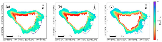 Bathymetric map of Wuzhizhou Island. (a) Control group. (b) Optimized group. (c) In situ group. The dashed ellipse indicates the focus area.