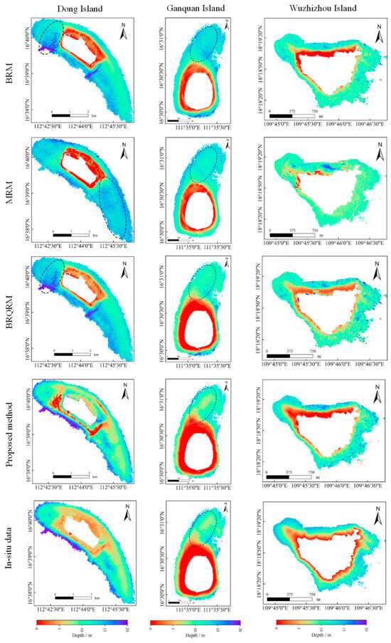 Rows 1–4 show the bathymetric inversion results of the three islands by BRM, MRM, BRQRM, and the proposed method, respectively. Row 5 shows the in situ data for the three islands. The dashed ellipse indicates the focus area.